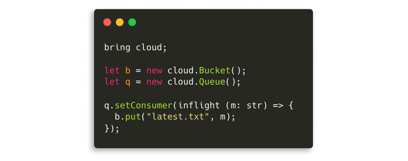 The Wing Programming Language (winglang) enables developers to write code that includes both infrastructure and runtime code. This means that when a cloud resource is needed, I can just add it to my code and interact with it in the same way I would interact with in-memory objects in traditional languages. The compiler takes care of the mechanics required to provision the resource, configure the minimal IAM permissions and wire up the infrastructure configuration so your code can interact with this resource at runtime.