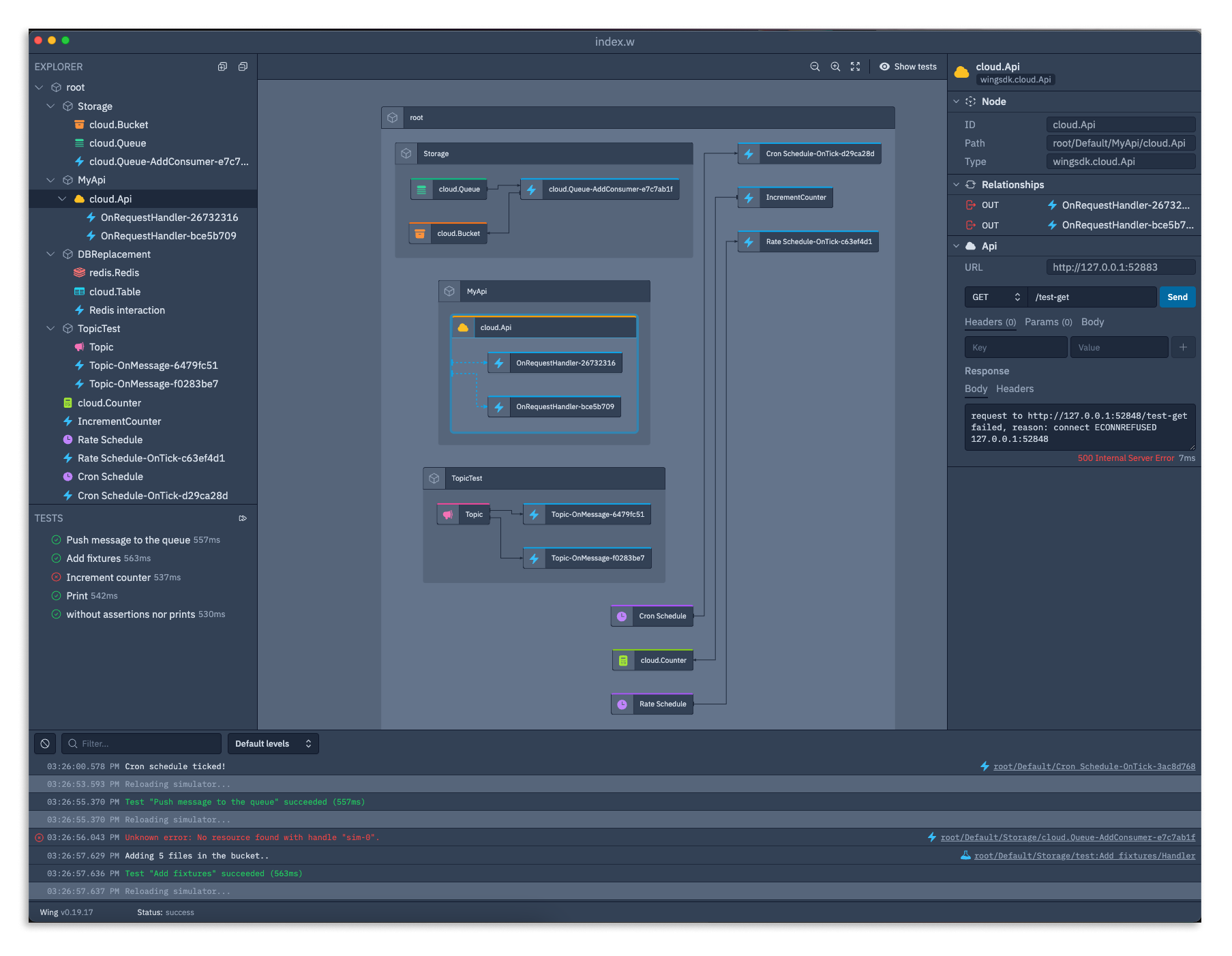 To that end, the Wing language, the SDK and the Wing Console all work together to offer first-class support for cloud testing.